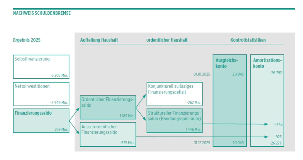 Der strukturelle Finanzierungsüberschuss (1,4 Mrd.) und die ausserordentlichen Einnahmen (0,6 Mrd.) werden dem Amortisationskonto gutgeschrieben, die ausserordentlichen Ausgaben (1,5 Mrd.) diesem Konto belastet. Ende 2025 lag der Fehlbetrag des Amortisationskontos somit bei 26,3 Milliarden (2024: -26,8 Mrd.). Das Ausgleichskonto blieb 2025 unverändert (+20 Mrd.).