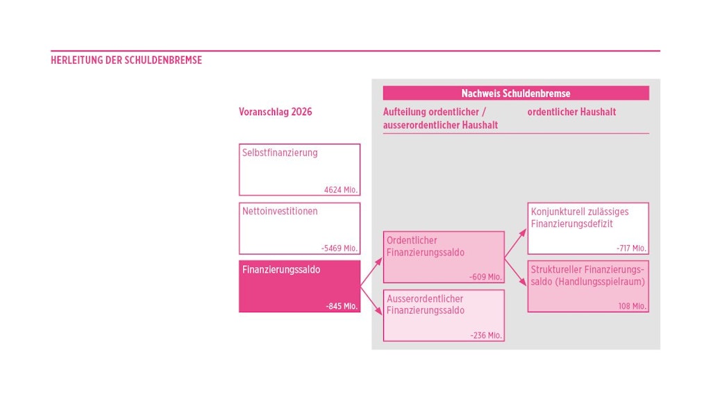 Im Voranschlag 2026 beträgt der Konjunkturfaktor 1,008, was eine Unterauslastung der Wirtschaft um 0,8 Prozent anzeigt. Die Schuldenbremse lässt deshalb im ordentlichen Haushalt ein konjunkturelles Finanzierungsdefizit von 717 Millionen zu. Dieses wird im Voranschlag 2026 grösstenteils in Anspruch genommen; es bleibt ein Handlungsspielraum von 108 Millionen (struktureller Finanzierungsüberschuss). Die Vorgaben der Schuldenbremse werden somit im Voranschlag 2026 eingehalten. Trotz der ab 2027 vorgesehenen Entlastungsmassnahmen drohen ab 2029 hohe strukturelle Finanzierungsdefizite.
