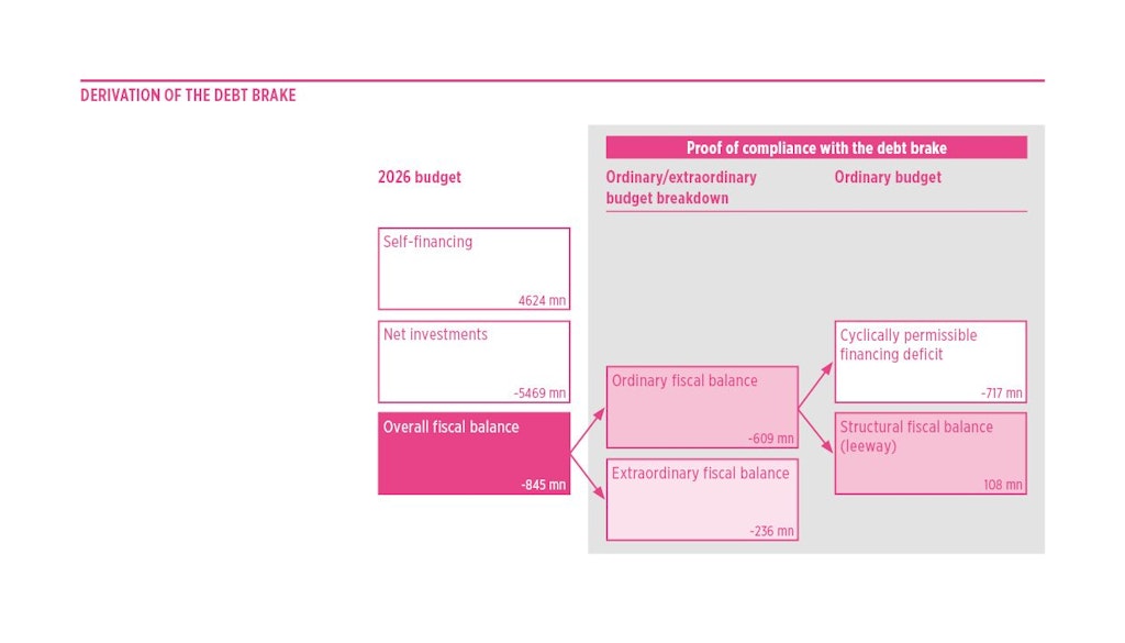 A financing deficit of 845 million is forecast for 2026, and is attributable largely to the ordinary budget (-609 mn). The ordinary financing deficit can in turn be subdivided into a cyclical and a structural component.