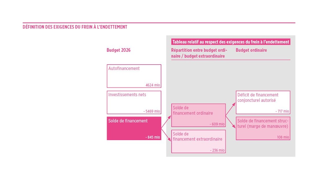 Un déficit de financement est prévu pour 2026 (-845 mio), qui est principalement imputable au budget ordinaire (-609 mio). Le déficit de financement ordinaire peut à son tour être divisé en une partie conjoncturelle et une partie structurelle.