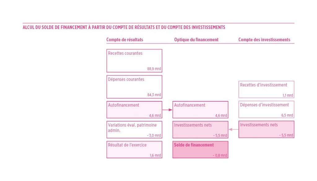 Calcul du solde de financement à partir du compte de résultats et du compte des investissements en milliards de francs