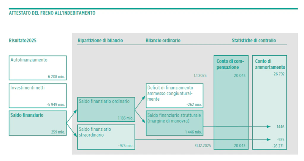 L’eccedenza di finanziamento strutturale (1,4 mia.) e le entrate straordinarie (0,6 mia.) sono accreditate al conto di ammortamento, mentre le uscite straordinarie (1,5 mia.) sono addebitate a questo conto. A fine 2025 il saldo del conto di ammortamento presentava quindi un deficit di 26,3 miliardi (2024: -26,8 mia.). Il saldo del conto di compensazione rimane invariato nel 2025 (+20 mia.).