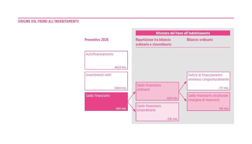 Per il 2026 è previsto un deficit di finanziamento (-845 mio.), riconducibile principalmente al bilancio ordinario (-609 mio.). Il deficit di finanziamento ordinario può essere suddiviso in una parte congiunturale e una strutturale.