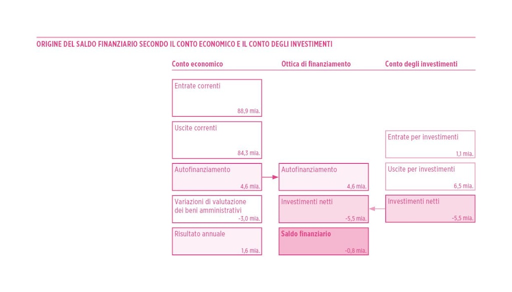 Il contributo finanziario proveniente dal conto economico (autofinanziamento) rimane stabile a 4,6 miliardi. Per contro, le variazioni di valutazione dei beni amministrativi (che comprendono in particolare gli ammortamenti e gli utili contabili da partecipazioni) diminuiscono complessivamente a -3,0 miliardi.